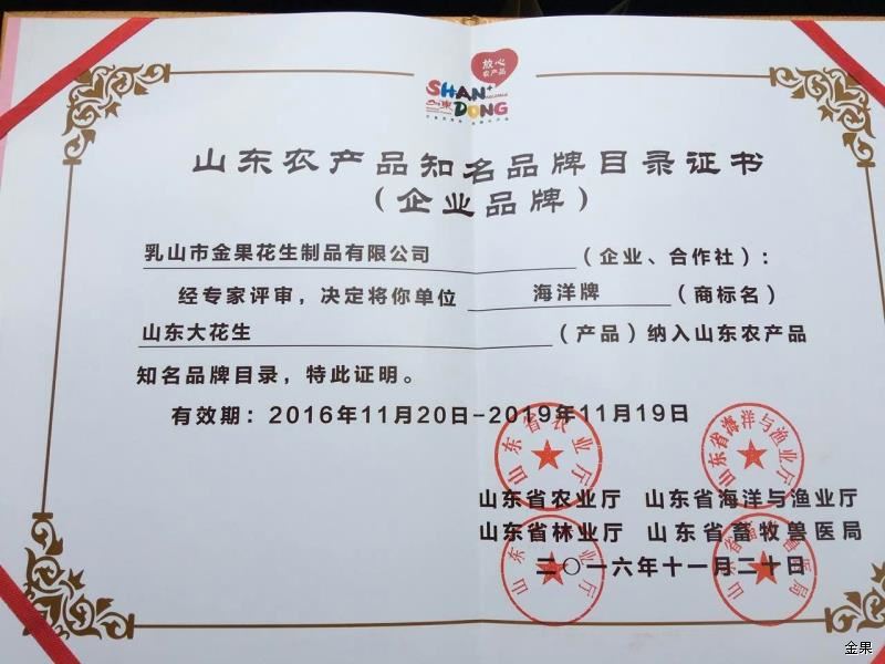 熱烈祝賀金果花生榮獲山東農(nóng)產(chǎn)品知名品牌目錄證書